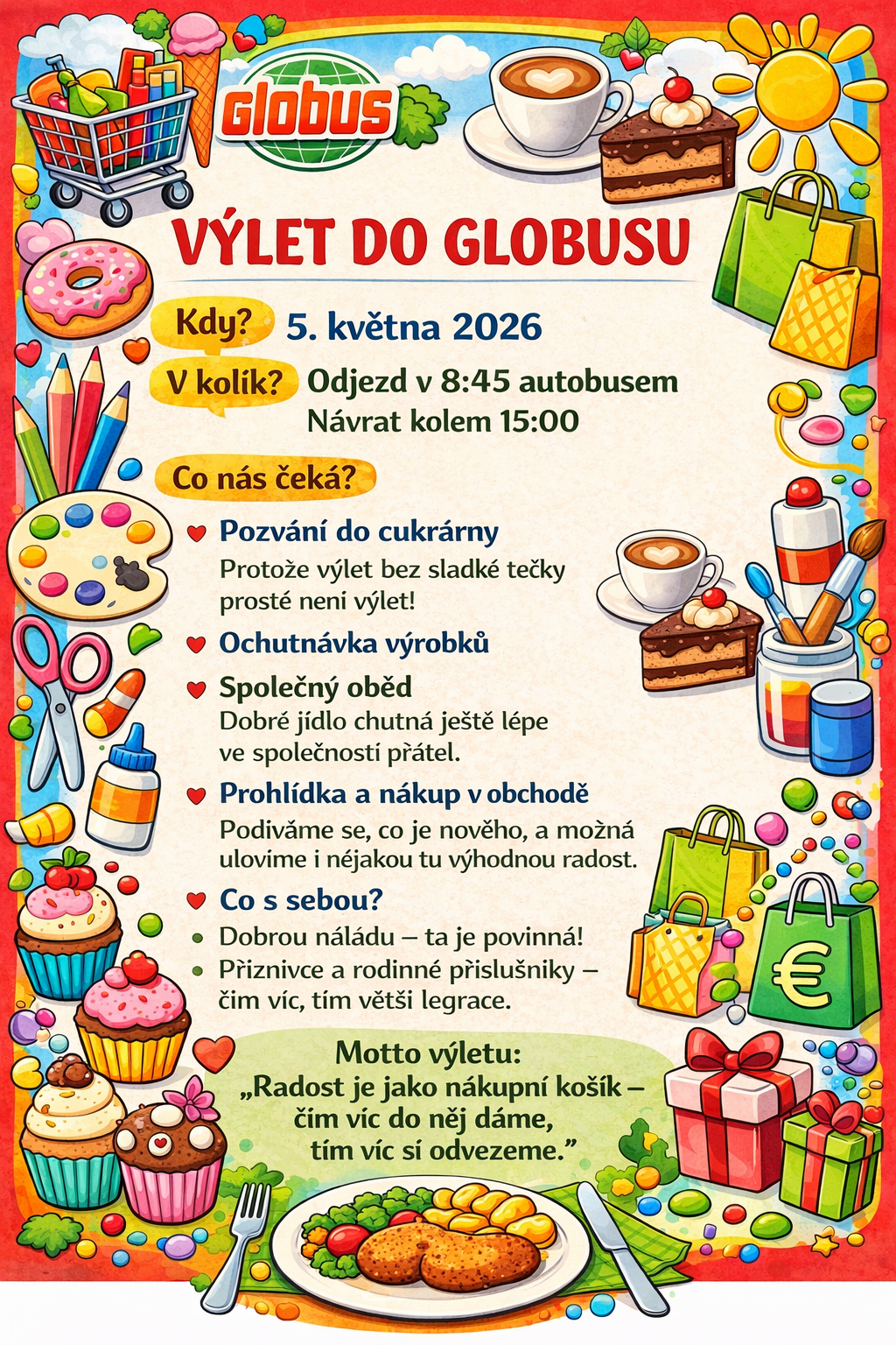 Zveme všechny naše příznivce na náš výlet do olomouckého obchodního domu Globus. Vítáme všechny, kdo chtějí zažít báječnou atmosféru při doprovodu našich klientů.